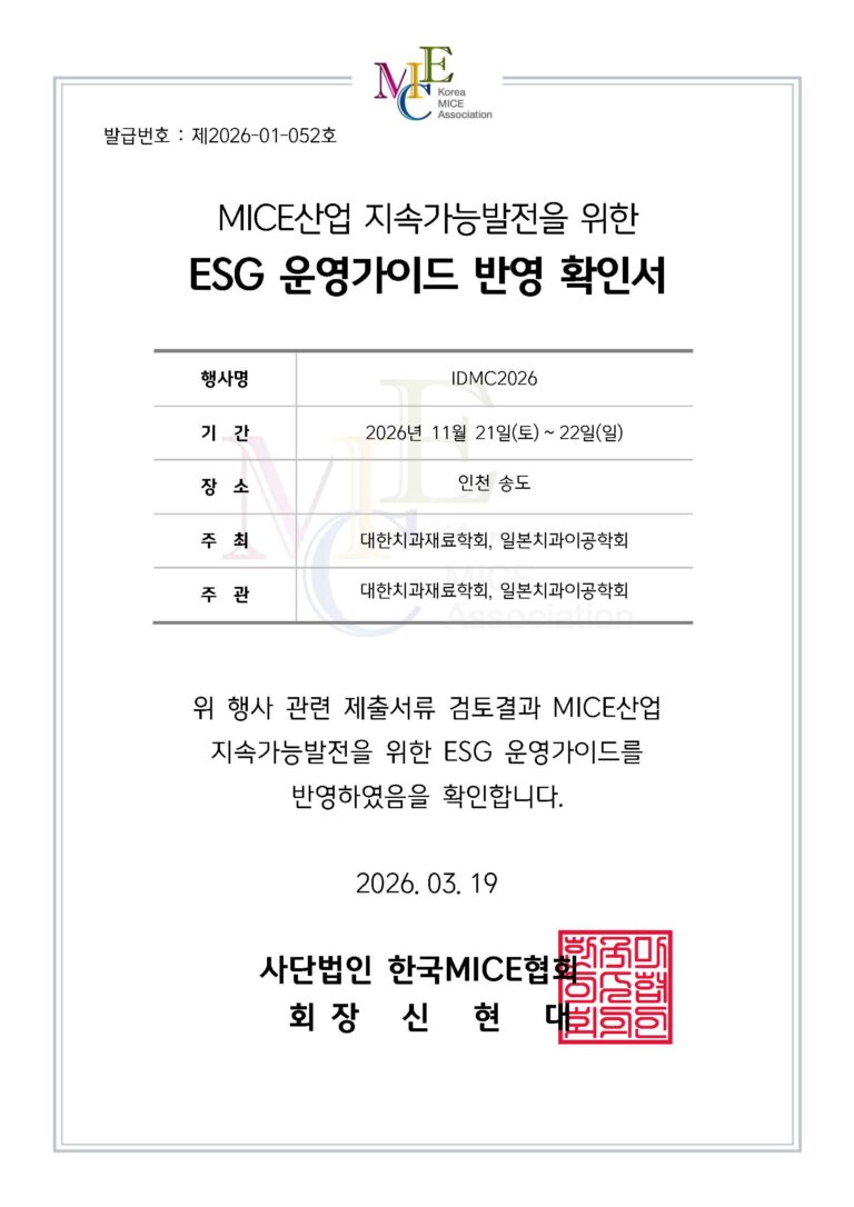 The International Dental Materials Congress 2026 (IDMC 2026) is fully committed to adhering to the ESG (Environmental, Social, and Governance) operational guidelines for the sustainable development of the MICE industry. We proudly declare our dedication to hosting an eco-friendly and sustainable international congress by consciously minimizing our environmental footprint and maximizing our positive impact on society.